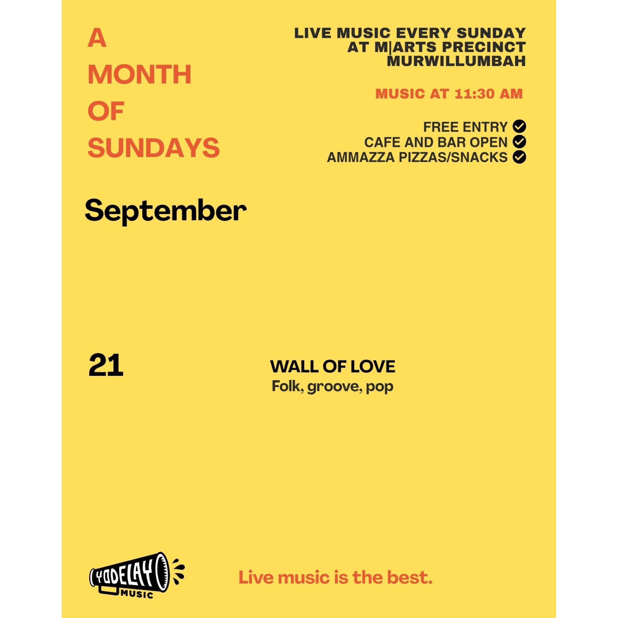 Sunday sessions – Wall of LoveHead down to M|Arts for Wall of Love – playing folk, groove and pop music.+ Add to Google Calendar+ iCal / Outlook exportArchivesOctober 2023August 2023June 2022October 2021July 2021May 2021March 2021November 2020June 2020October 2019